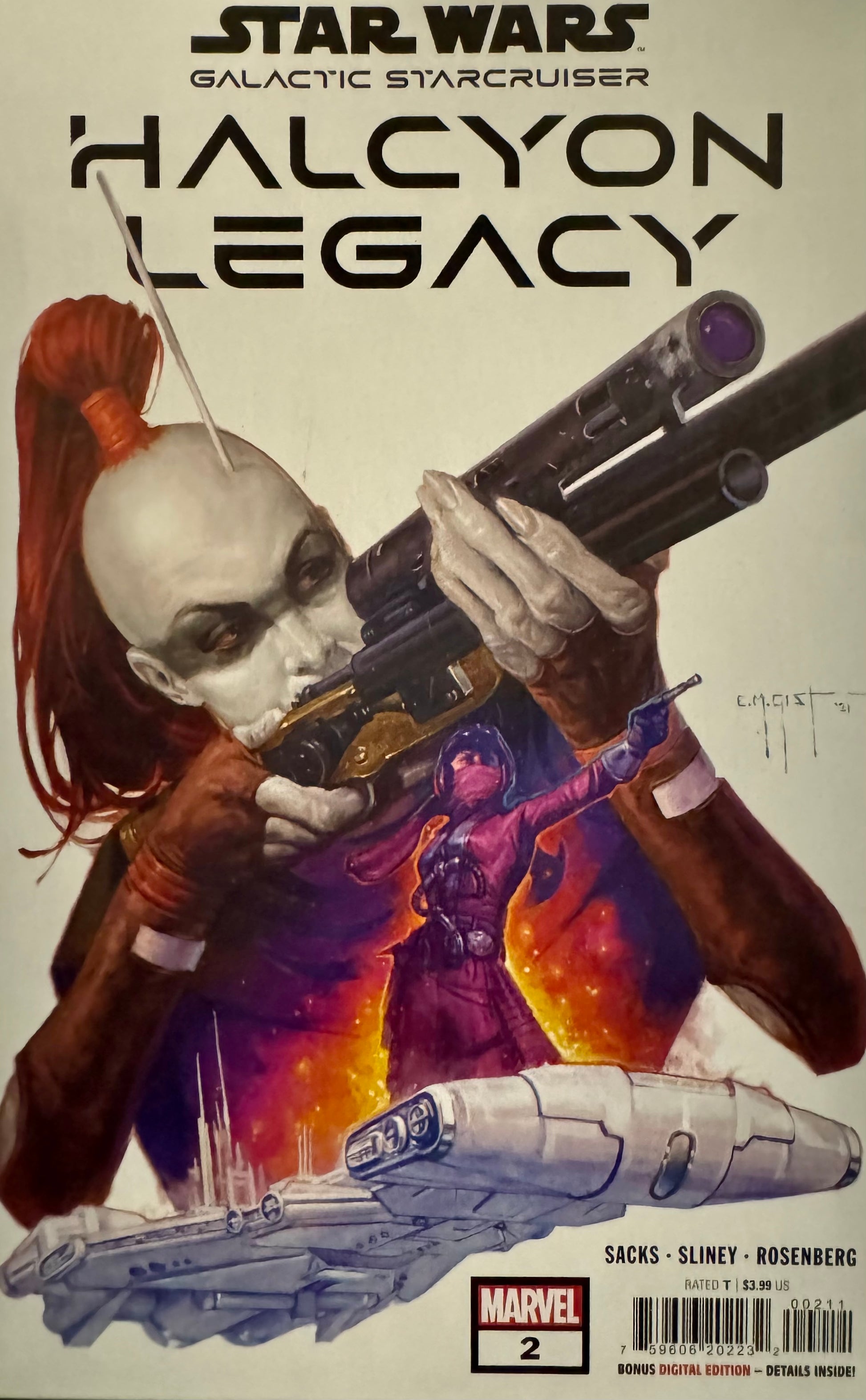 Written by Ethan Sacks. Art by Will Sliney. Cover by E.M. Gist. YOUR TICKET TO THE HOTTEST RIDE IN THE GALAXY! The Halcyon comes under fire from pirates - with little chance of escape! Who is the mysterious Resistance spy on board that may lead to the fiery end of the ship's 275-year run? And find out how, years earlier, bounty hunter AURRA SING and a mysterious partner gambled with their lives during the galactic starcruiser's era as a flying casino! 28 pages, full color. Rated T